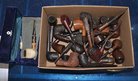 Scatola contenente numerose pipe di marche e materiali diversi (difetti)