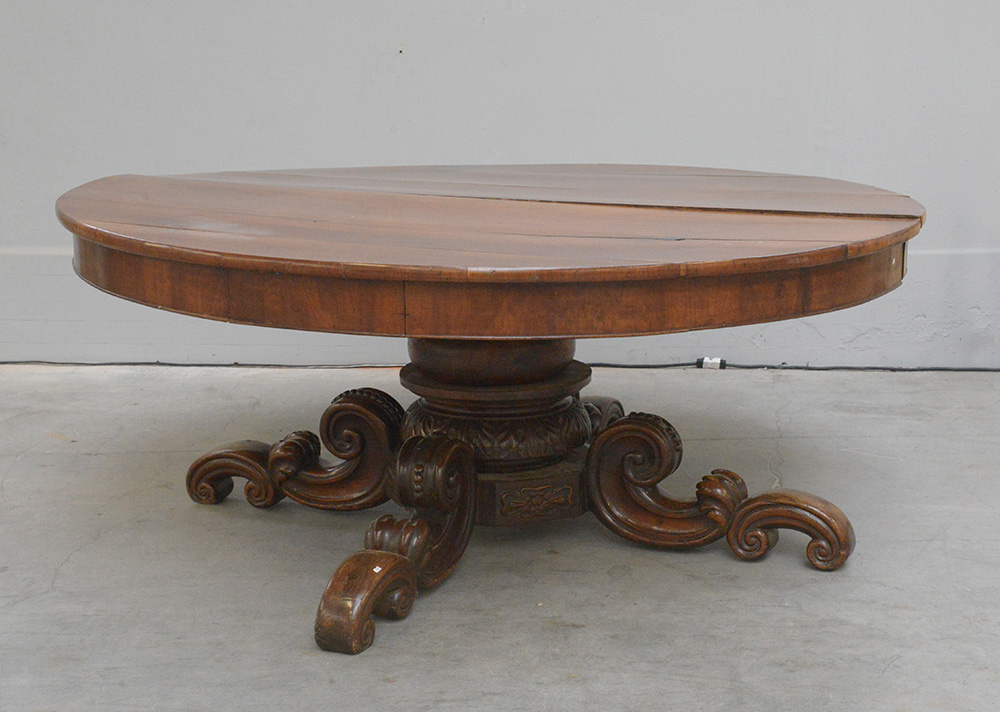 Tavolo da pranzo con piano tondo allungabile lastronato in noce, gamba centrale tornita intagliata a motivi vegetali, terminante a quattro gambe scolpite a riccioli e volute. Secolo XIX (d cm 184 h 74) (Difetti)