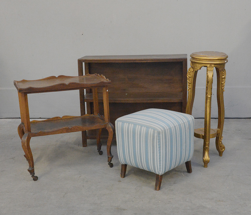 Lotto composto da una librerietta a giorno e un carrello portavivande in legno, una base tripode in legno dorato e un pouf rivestito con tessuto a righe. (Difetti)