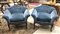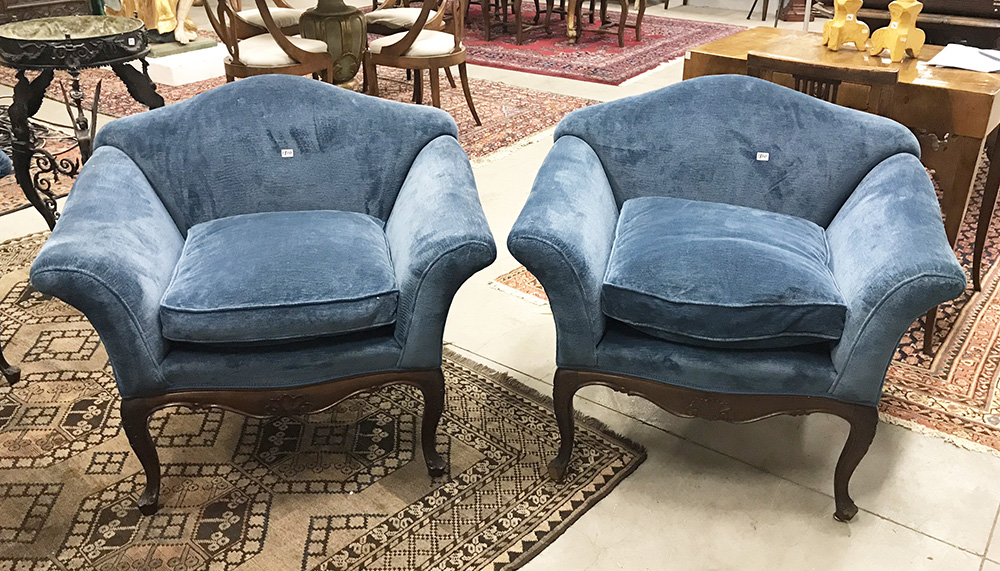 Coppia di poltrone a orecchioni in legno intagliato con gambe di forma mossa. Rivestite in tessuto di colore blu. Secolo XVIII (cm 91x83x72) (difetti)