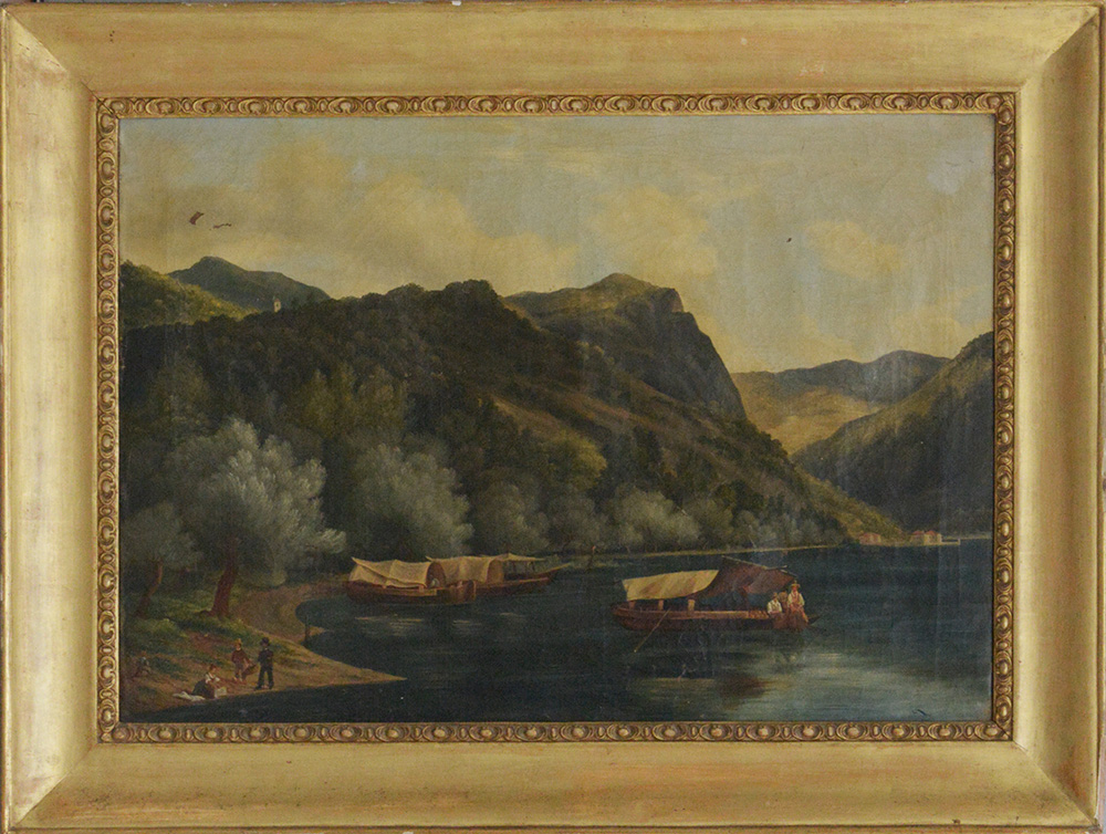"Scorcio del lago di Como" 1837, olio su tela (cm 55x75) Firmato e datato in basso a destra. In cornice dell'epoca in legno dorato con profilo interno intagliato. (Difetti)