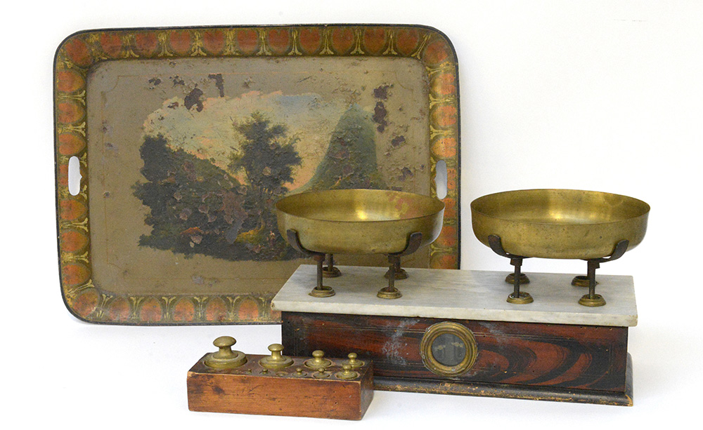 Lotto composto da una bilancia basculante in legno, ottone e marmo con porta pesi (scompleto) e un vassoi in latta dipinto in policromia. (Difetti)