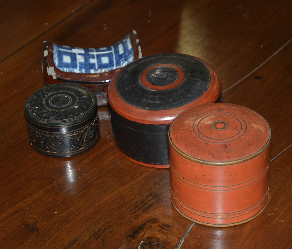 Lotto composto da quattro scatole di forme, materiali, decori ed epoche diversi di manifattura orientale (difetti)