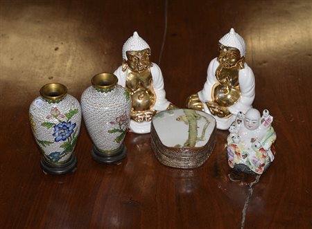 Lotto composto da tre sculture in ceramica raffiguranti Buddha, due vasetti in cloisonné e una scatola, di decoro e misure diverse (difetti)