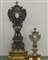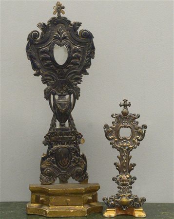 Lotto composto da un portareliquie in argento cesellato a vaso, motivi floreali e vegetali del sec. XVIII (h cm 48) unito ad uno in rame sbalzato del sec. XIX (h cm 30) entrambi montati su base in legno (difetti e mancanze)