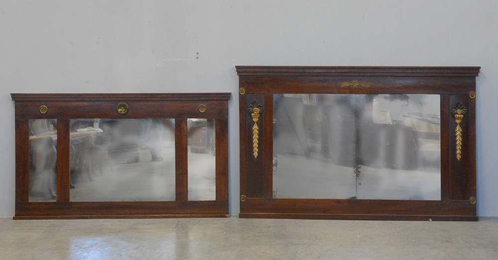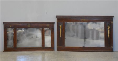 Due caminiere lastronate in noce, decorate da rosoni in metallo. Una con...