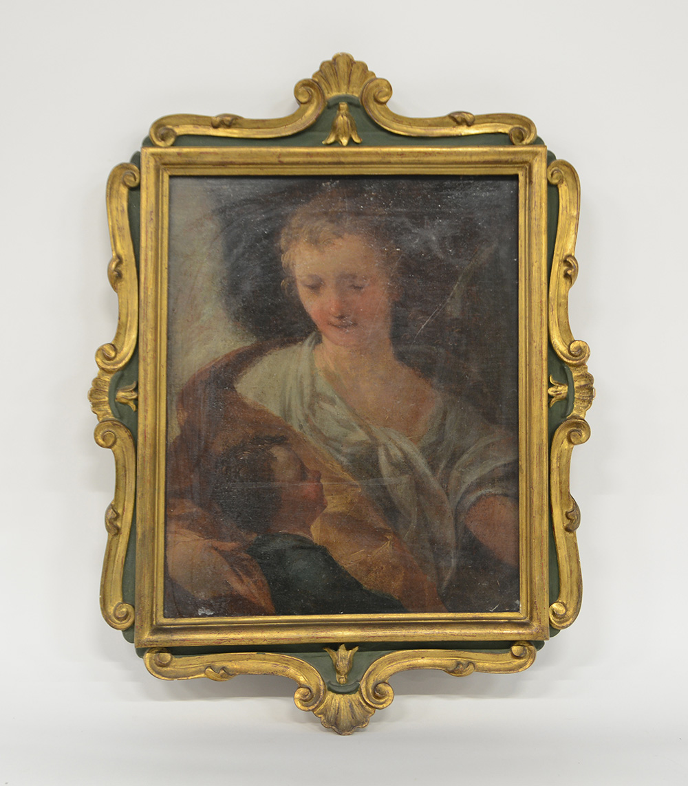 Scuola del secolo XVIII "Figure" olio su tela (cm 40x32) In cornice laccata e dorata (difetti)
