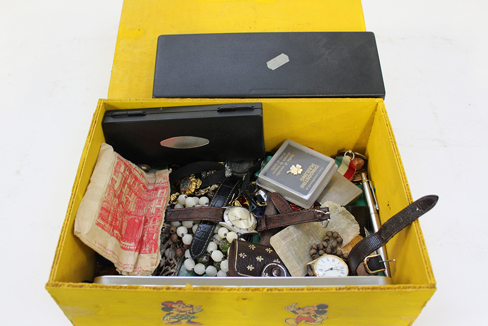 Scatola con bijoux vari, orologi, penna a sfera e da segnalare calibro...
