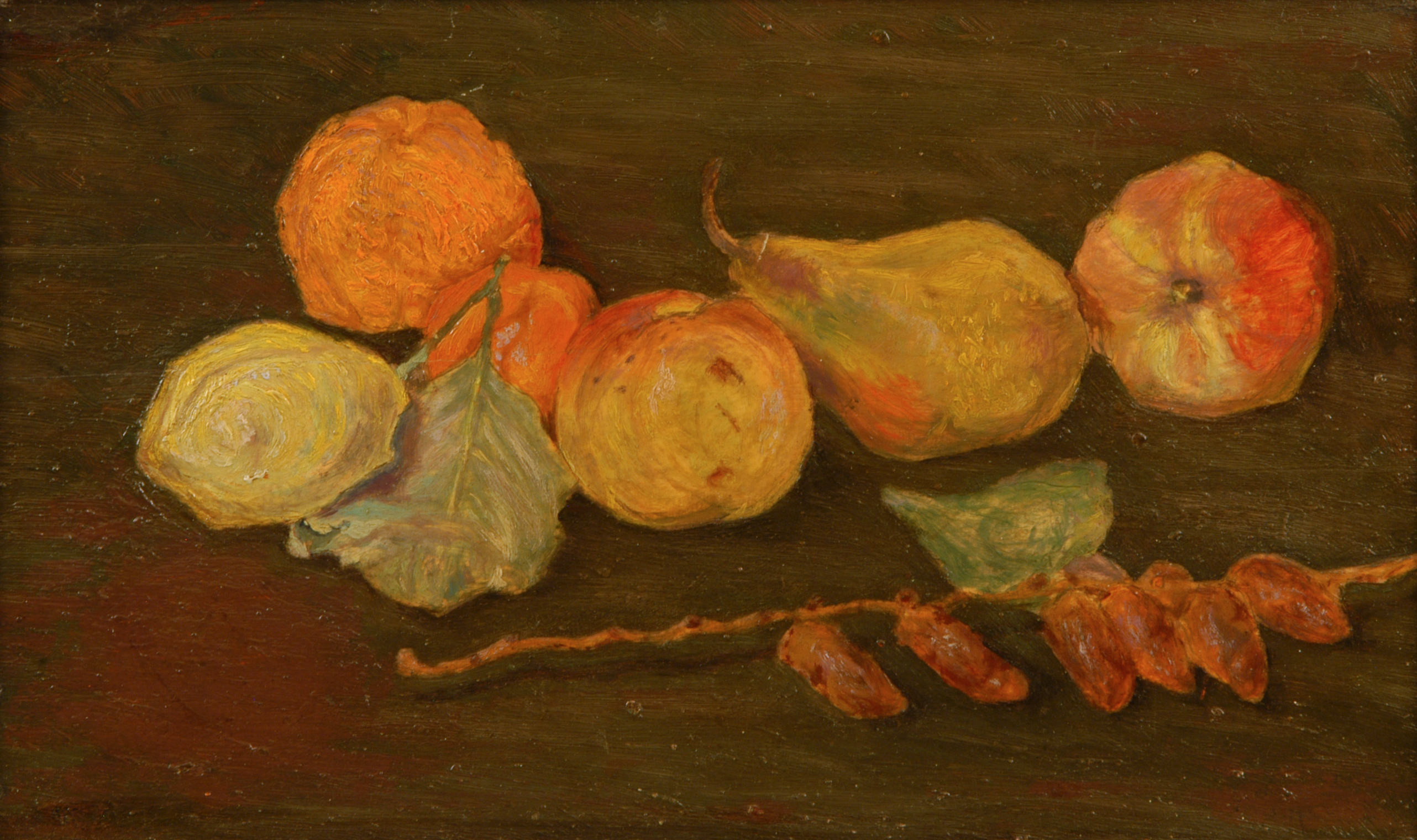 Giovanni March Natura morta, 1916 Olio su tavola, cm. 24x40,5 Sul verso: scritto di Autenticità di Lorena Fantini March; Etichetta e timbri "Società delle Belli Arti - Circolo degli Artisti Casa di Dante", con descrizione.