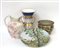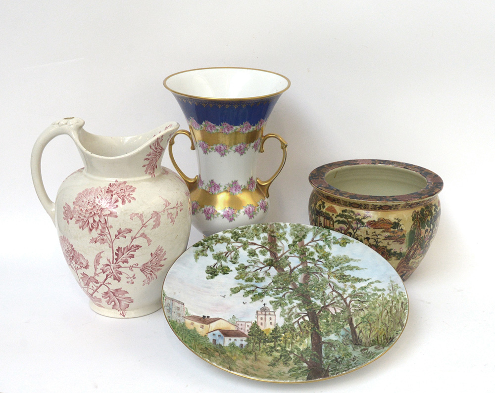 Lotto composto da un vaso biansato in porcellana, un versatoio a decoro floreale, un piatto dipinto a paesaggio e un cachepot cinese dipinto con scene di vita (difetti)