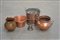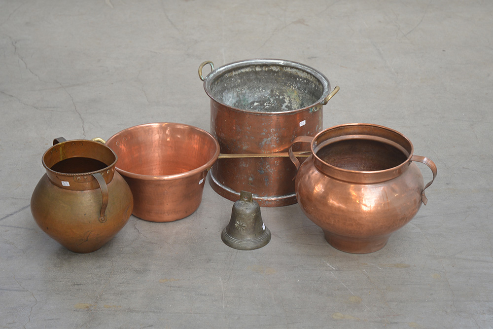 Lotto composto da tre cachepot biansati, un paiolo in rame e una campanella in bronzo (difetti)