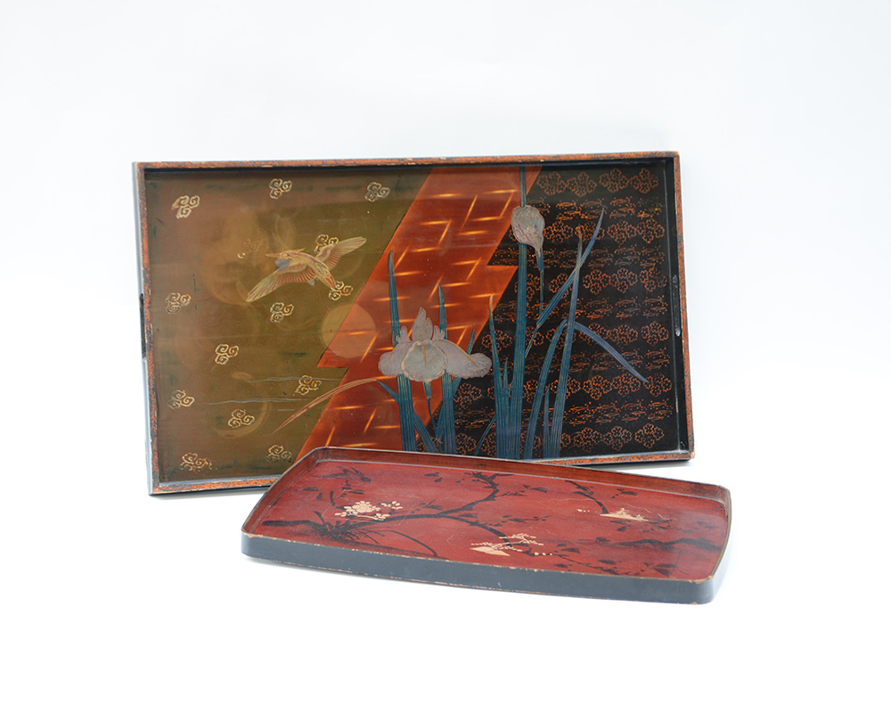 Lotto composto da due vassoi in legno laccato decorati a paeseaggi e motivi naturalistici (difetti)