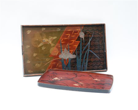 Lotto composto da due vassoi in legno laccato decorati a paeseaggi e motivi...