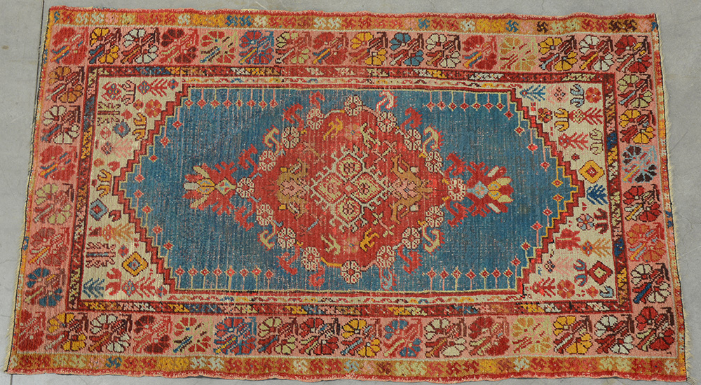 Tappeto Kirsheir, Anatolia inizio secolo XX. Disegno a medaglione composito rosso su fondo ottanio (cm 166x102) (difetti)