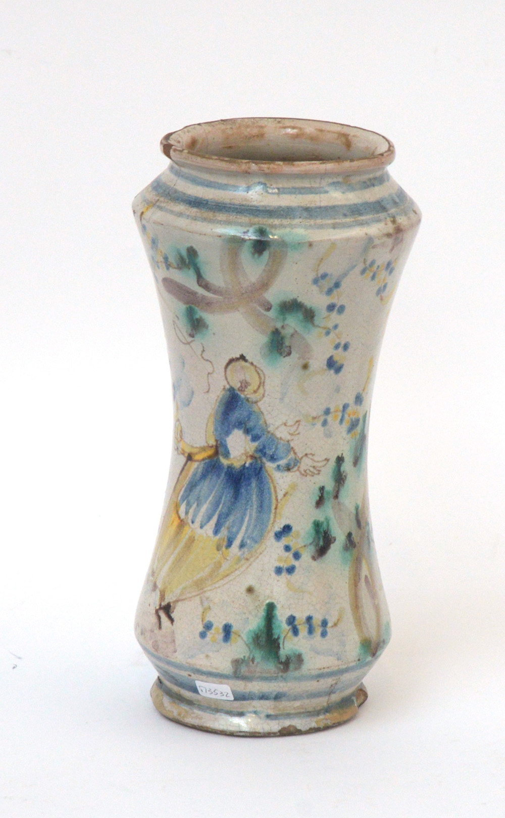 Antico alberello in maiolica policroma decorata con figure e motivi floreali (difetti)
