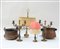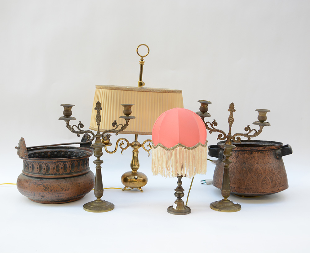 Lotto composto da quattro candelieri di diversa epoca e due vasi in rame (difetti)