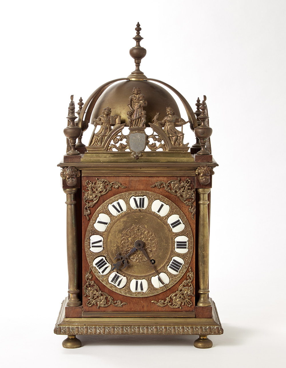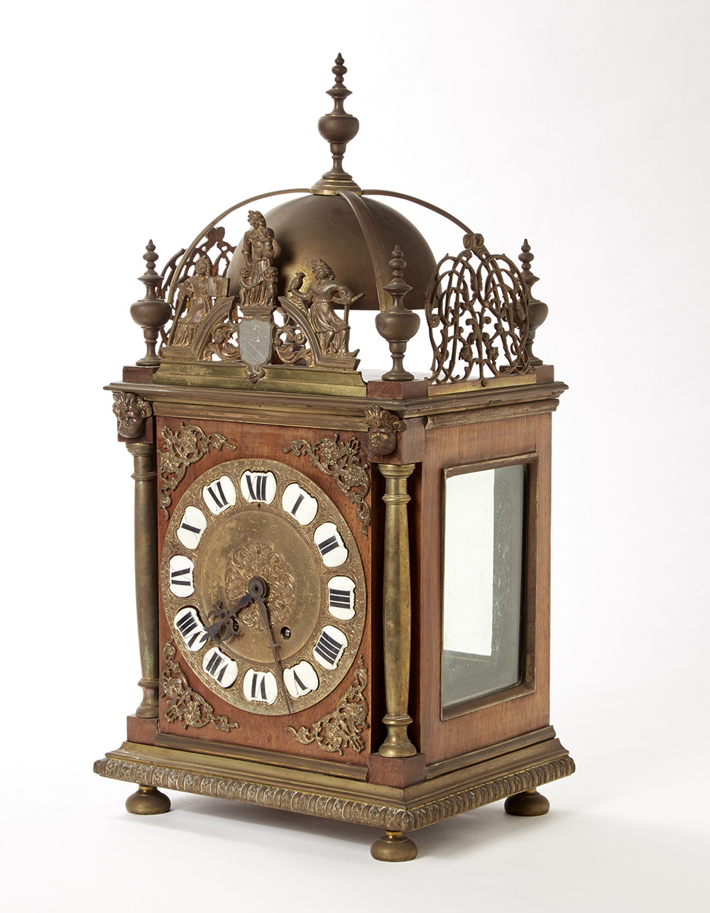 Orologio da appoggio in legno e bronzo su imitazione delle lanterne inglesi