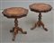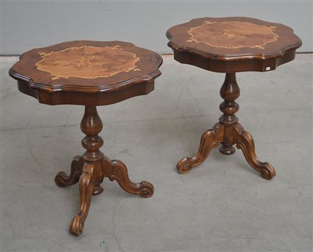Coppia di tavolini da salotto tripodi con piani polilobati e decori floreali a intarsio (cm 55x59x55) (difetti)