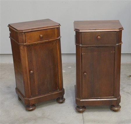 Coppia di comodini in noce ad un anta ed un cassetto. Fine secolo XIX. (Difetti e mancanze)