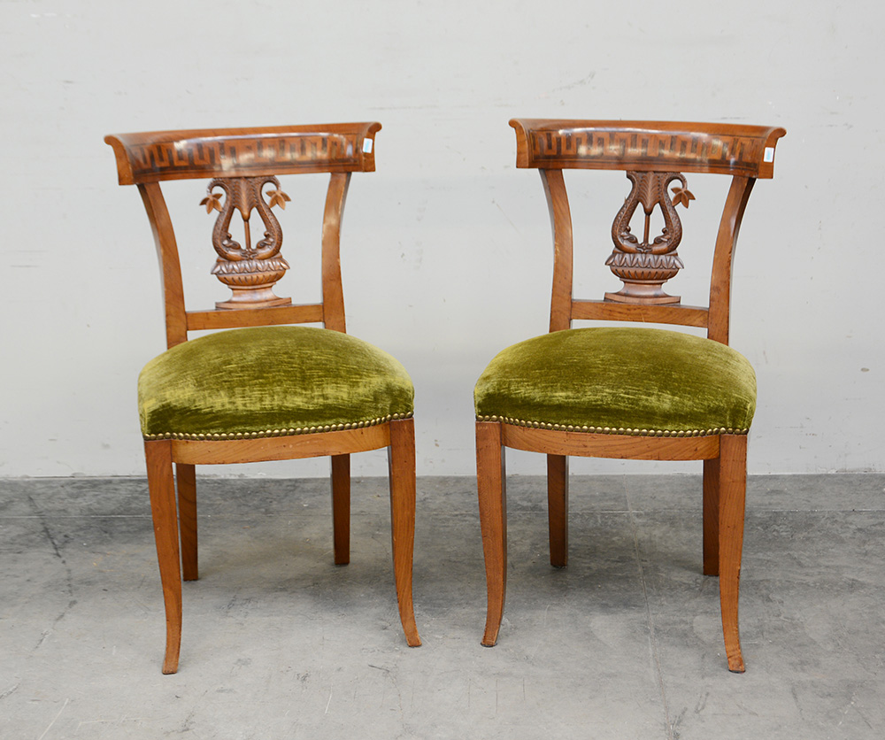 Coppia di sedie con schienale intarsiato a motivo concatenato e cartelle...