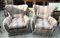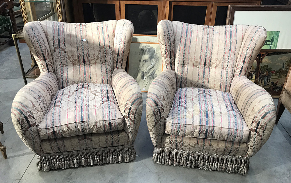 Coppia di poltrone con schienale di forma avvolgente, rivestite in tessuto...