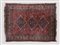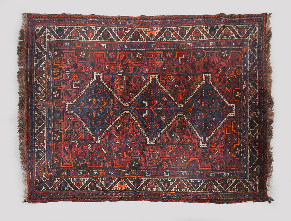 Tappeto Shiraz, Persia secolo XX. Disegno con tre medaglioni a fondo blu su campo rosso (difeti) (cm 213x153)