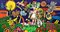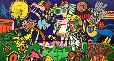 Guillaume Corneille Senza titolo, 1975 Serigrafia su tela ritoccata a mano, cm. 150x280, composta da 4 tele di cm. 100x70 e 4 tele di cm. 50x70 Firma e data in basso a sinistra. Sul pianetto: firma; Timbro "Realizzazione Cegna Editore/ centro Maestà".