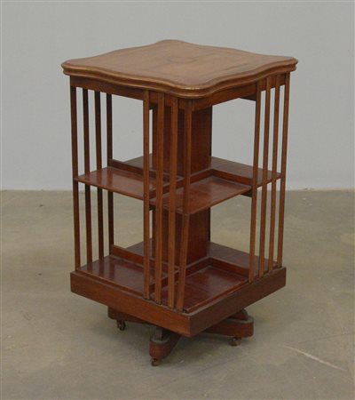 Librerietta girevole con piano sagomato, filettato e intarsiato con rosone, montante a listelli. Inghilterra inizio secolo XX (cm 50x85x50). (Difetti)