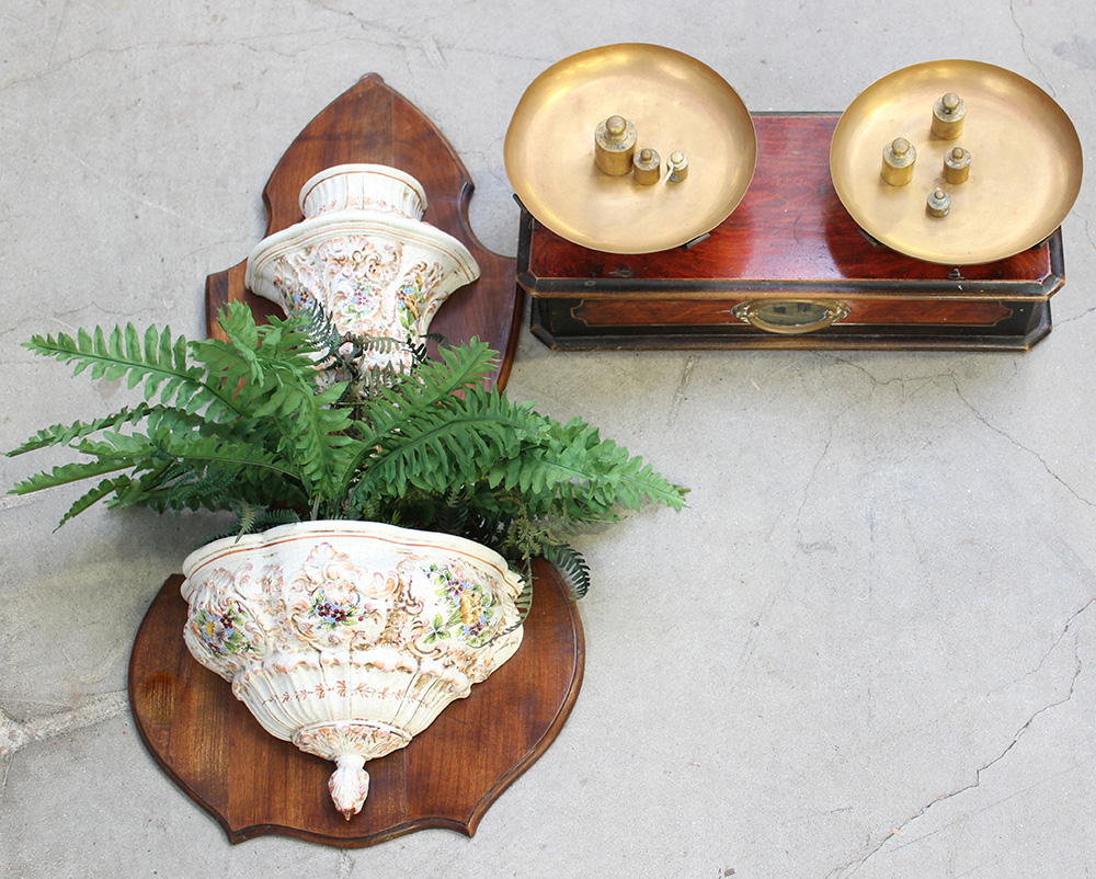 Lotto coposto da una bilancia con pesi ed un'acquamanile in ceramica montata su pannelli di legno