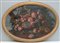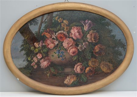 Ignoto "Vaso di fiori in un paesaggio" olio su compensato ovale (cm 60x84) In cornice (difetti)