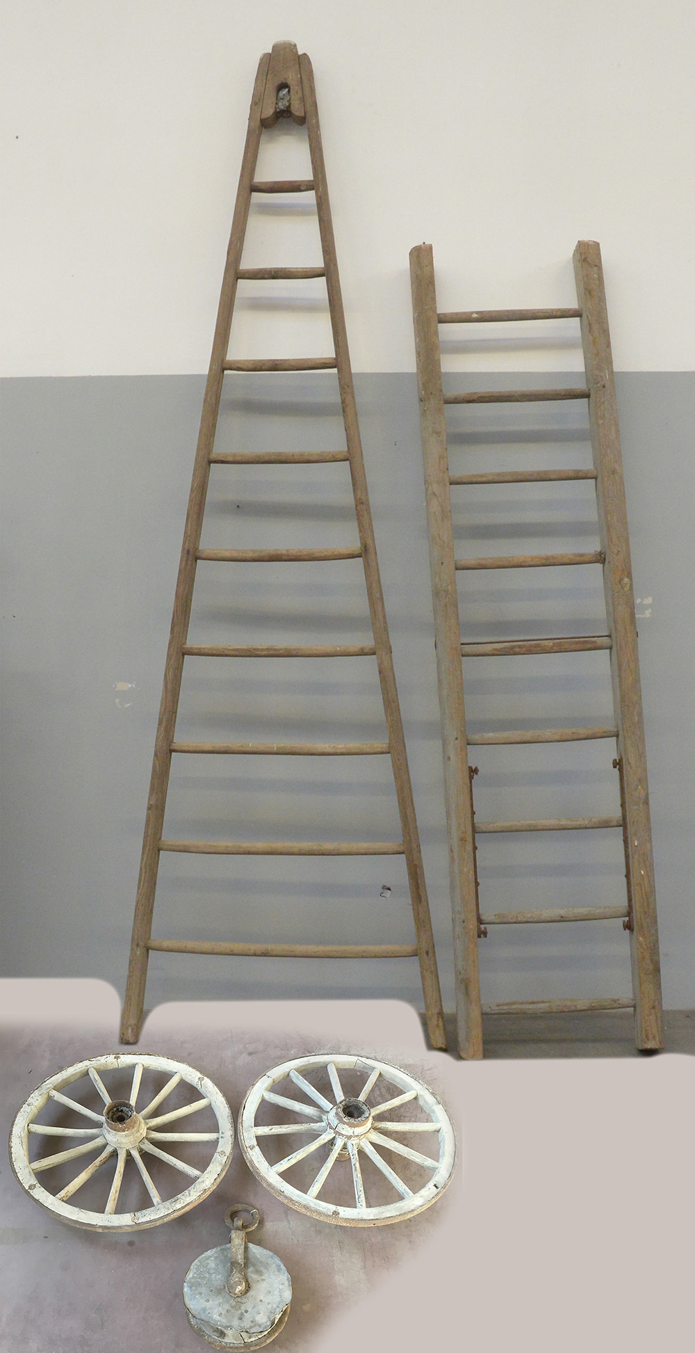 Lotto composto da una coppia di ruote per aratri, una carrucola e due scale a pioli in legno (difetti)