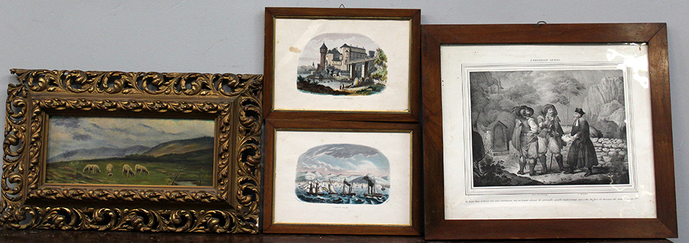 Cartone contenente diverse stampe e quadretti di diverse epoche e fatture (difetti)