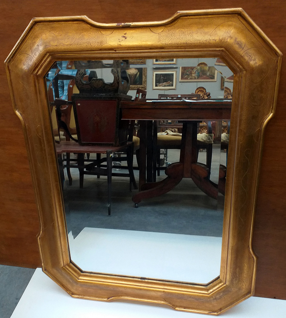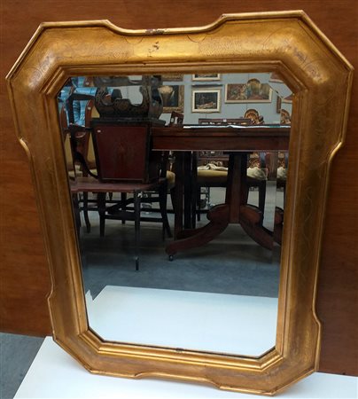 Specchiera a vassoio in legno inciso e dorato (cm 89x70). (Difetti).