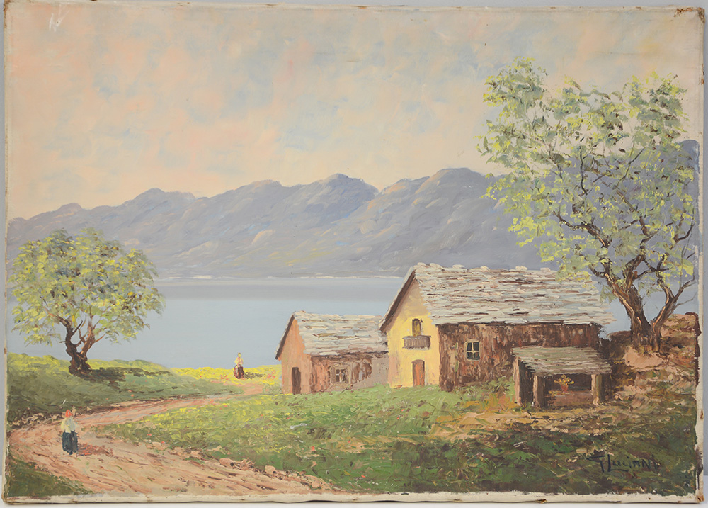 Firma indecifrata "Paesaggio lacustre con case" olio su tela (cm 50x70) firmato in basso a destra