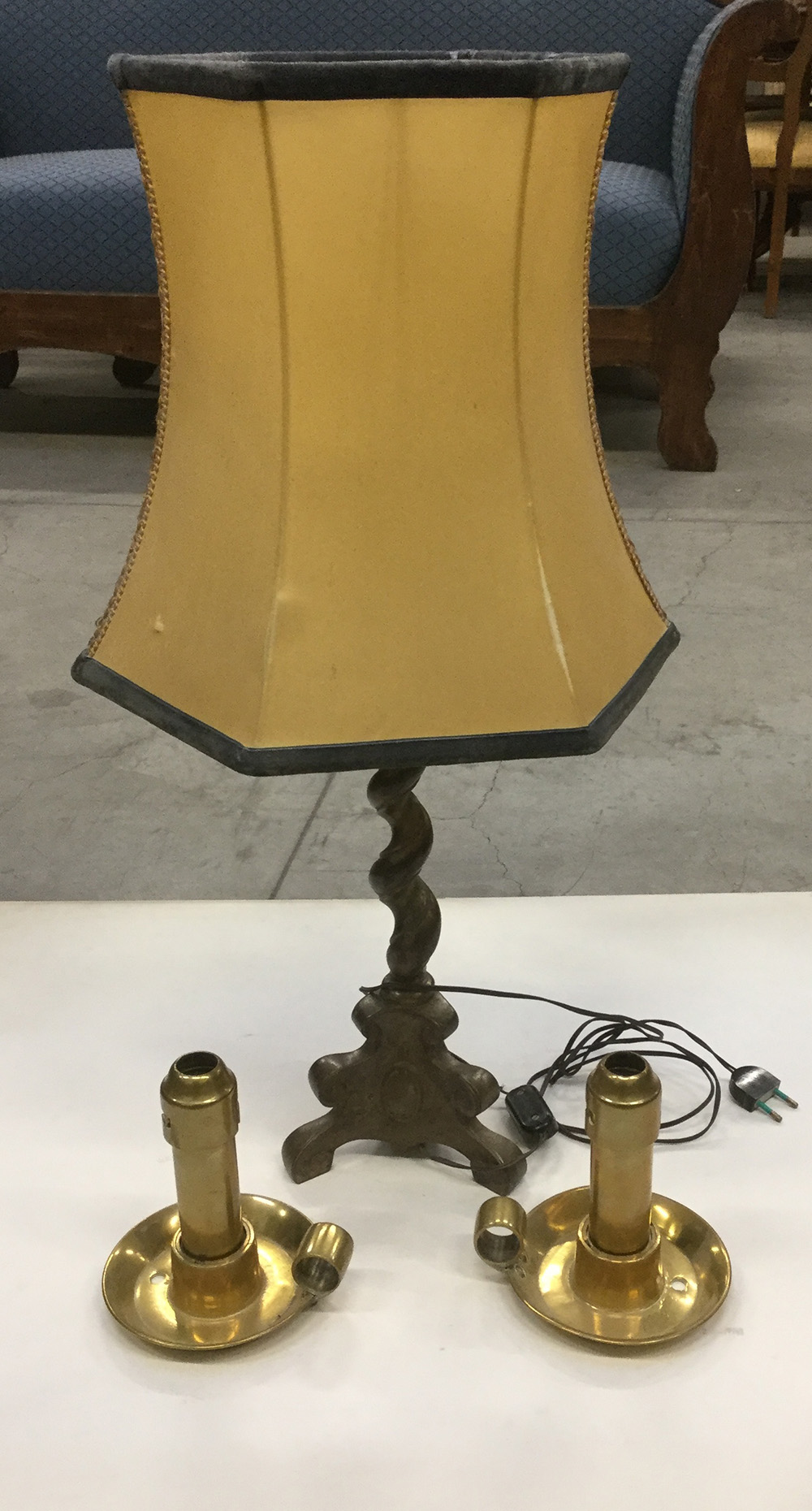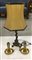 Lotto composto da due candelieri in ottone ed un candeliere tripode in bronzo montato a lce elettrica (h max 38). (Difetti)