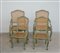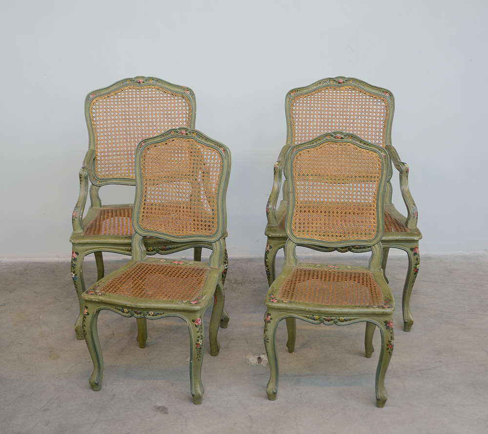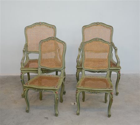 Lotto composto da da due poltrone e due sedie in legno laccato e dipinto con sedute e schienali incannucciati