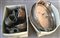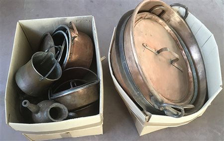 Lotto di due cartoni contenenti numerose pentole in rame con coperchi e die...