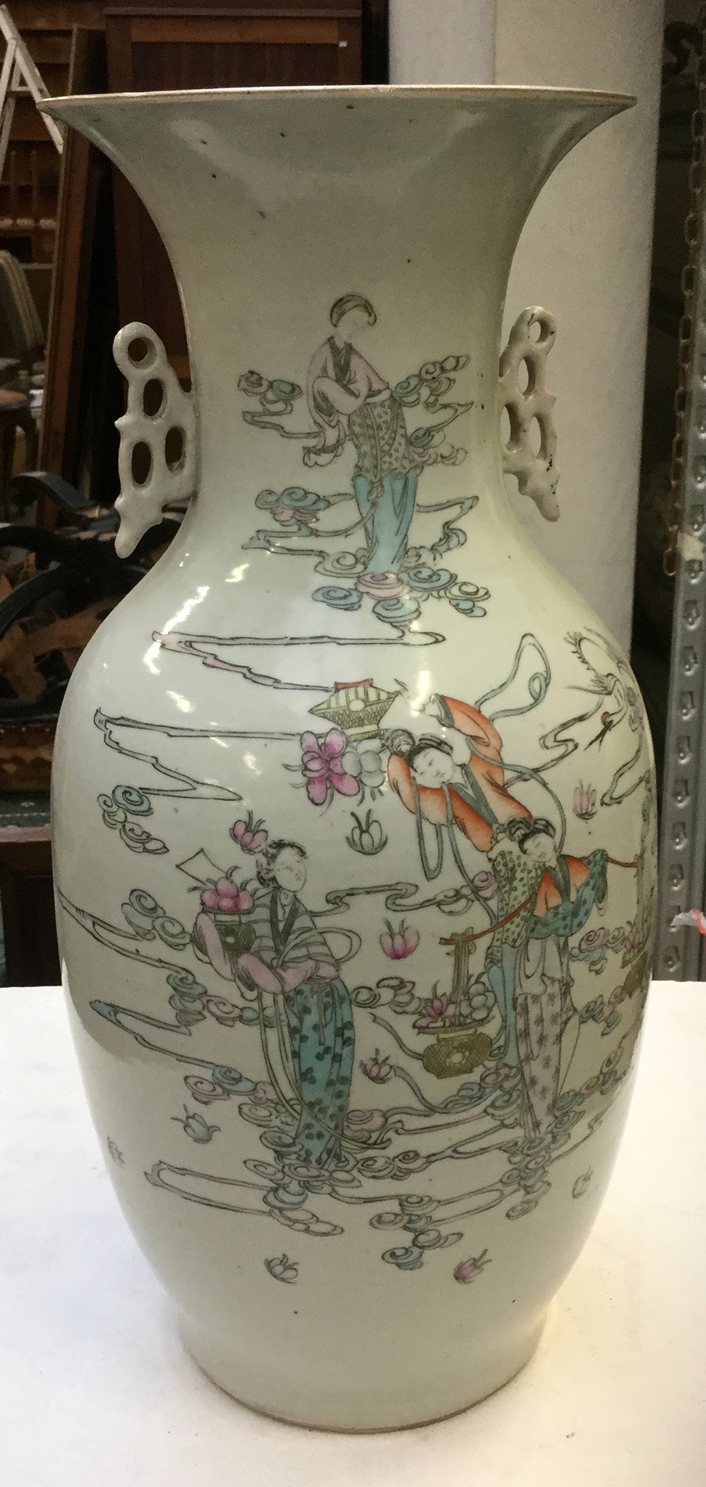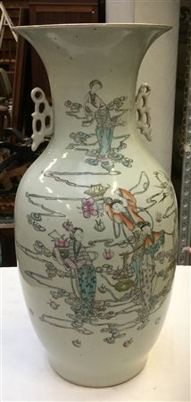 Vaso biansato in porcellana a smalti policromi decorato con danzatrici e calligrafia. Cina, sec. XX (h. cm 45) (difetti)
