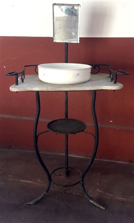Lavabo da camera con struttura in ferro battuto, piano in marmo bianco e catino in ceramica non pertinente (difetti e mancanze)