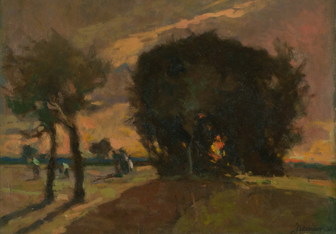 Ludovico Tommasi Paesaggio con figure Olio su cartone, cm. 32x45 Firmato in basso a destra. Sul verso: scritto di Autenticità di Mario Borgiotti.