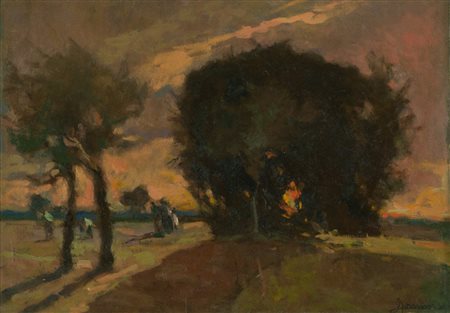 Ludovico Tommasi Paesaggio con figure Olio su cartone, cm. 32x45 Firmato in...