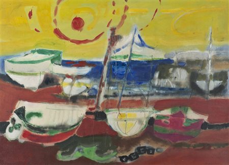 Enrico Paulucci Marina con barche Tecnica mista su carta intelata, cm. 48,5x66 Firmato in basso a destra. Sul verso: timbro di provenienza. Autentica dell'Artista su foto.