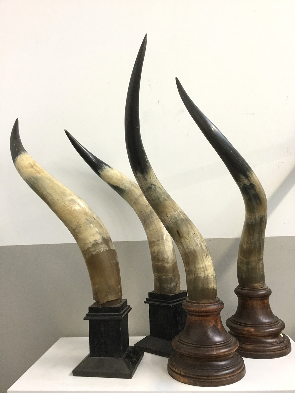 Lotto di due coppie di elementi decorativi con corna bovine su basi in legno, inizio secolo XX (h max cm 82) (difetti)