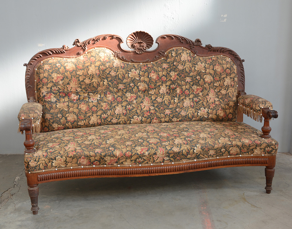 Divano a tre posti in noce con schienale sagomato e intagliato a motivi floreali e conchiglia centrale. Secolo XIX (difetti)