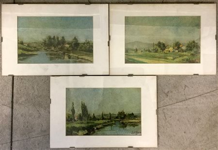 "Paesaggi" tre piccoli dipinti ad olio su tela applicata su cartoncino pressato. Firmati, datati 1947 (cm 13x21) con supporto Pico glass