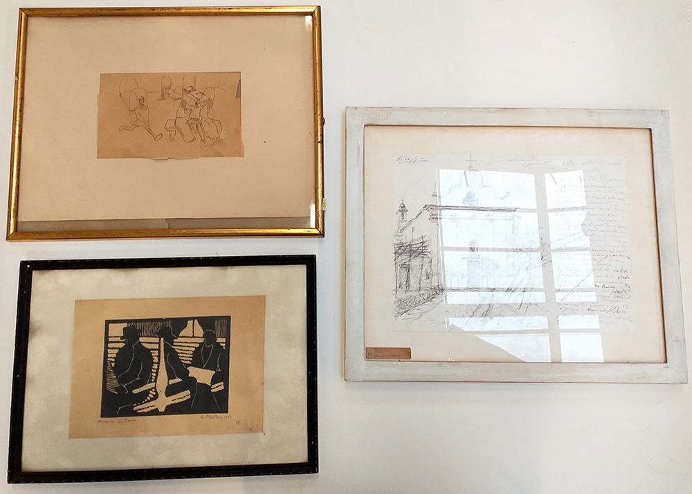 Lotto composto da una xilografia firmata Platone e datata 1951, una stampa firmata Lorenzo Viani ed un disegno in cornice raffigurante la chiesetta dell'Assunta a Varazze. Misure diverse, in cornice. (Difetti).