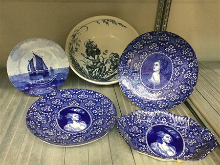 Lotto composto da un centrotavola in ceramica a decoro floreale blu della S. C. Richard, un vassoietto e due piatti decorati con fiori e ritratti femminili e un piatto con marina (difetti e restauri)