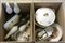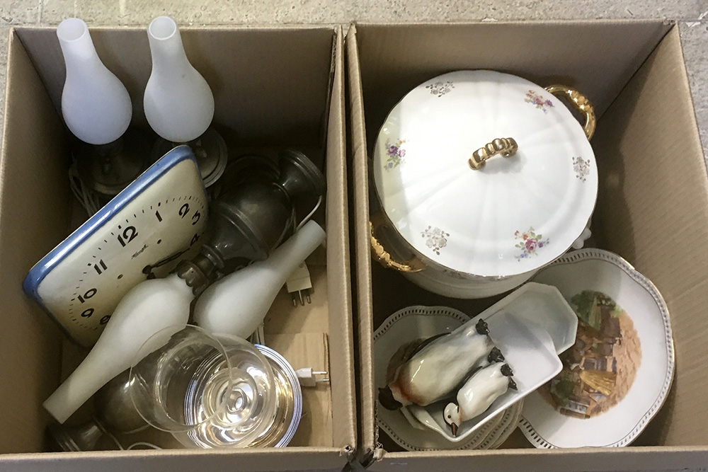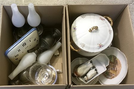 Lotto di due cartoni contenenti quattro lampade in peltro con paralumi in vetro lattimo, un candeliere marcato Chistofle, un orologio da parete e parti di servizi per la tavola (difetti)