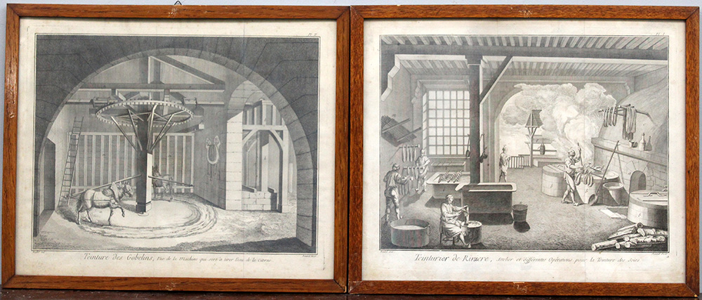 Gruppo di quattro antiche stampe francesi raffiguranti macchinari e tintori della manifattura di Gobelins, in cornici