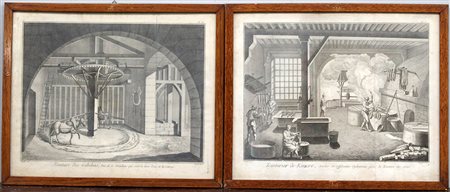 Gruppo di quattro antiche stampe francesi raffiguranti macchinari e tintori...